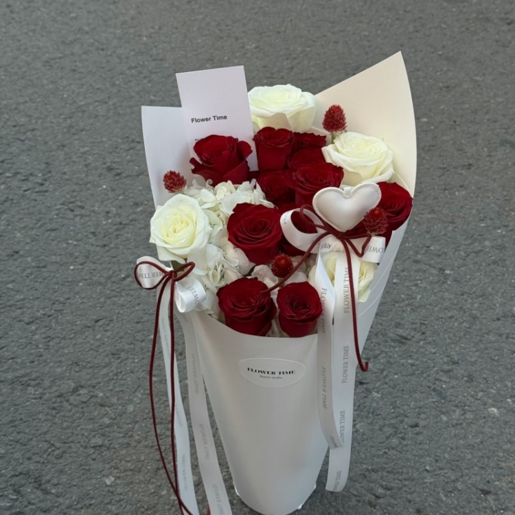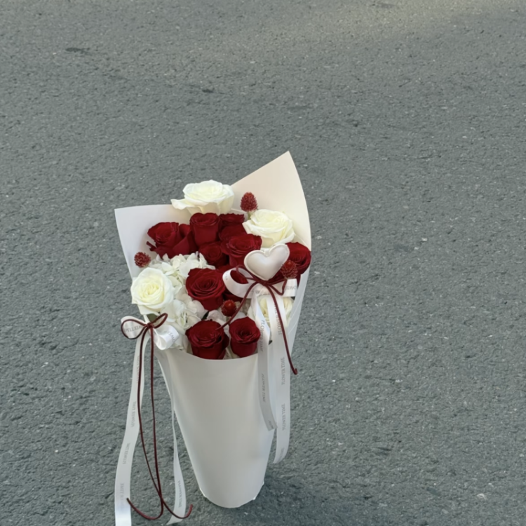 热烈的红玫瑰搭配温柔的白玫瑰,绣球混搭花束