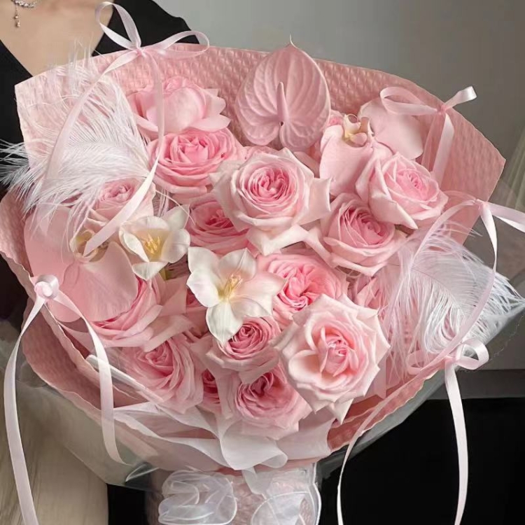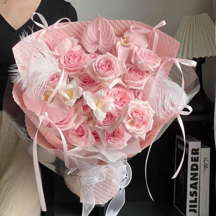 粉玫瑰21朵,郁金香蝴蝶兰若干,氛围感羽毛2枝