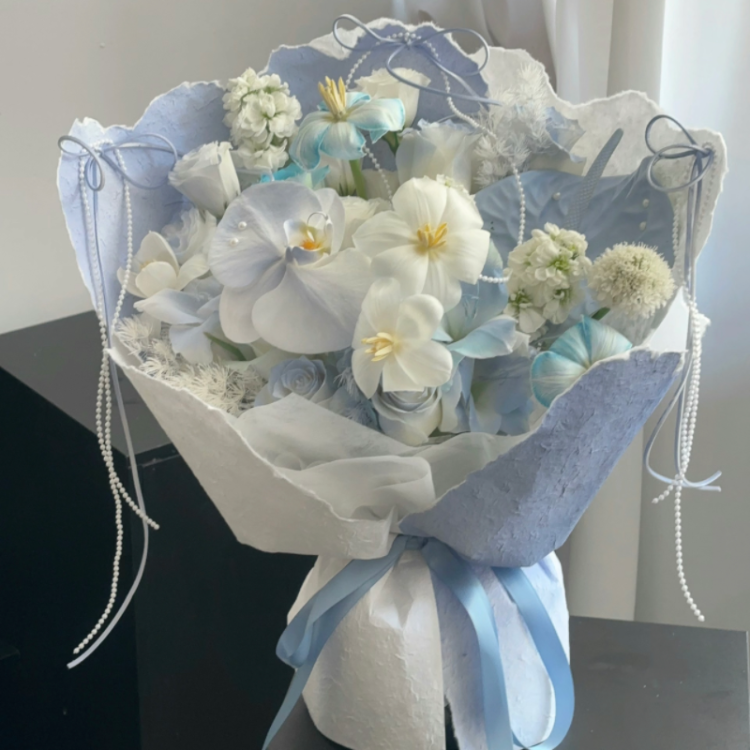 碎冰蓝玫瑰,紫罗兰,郁金香,蝴蝶兰混搭花束