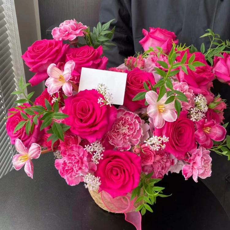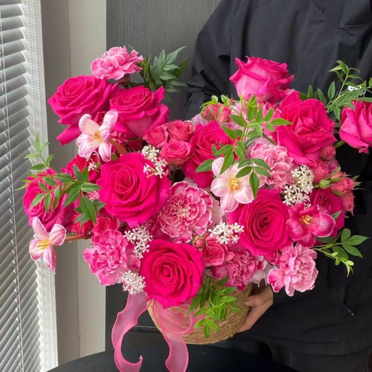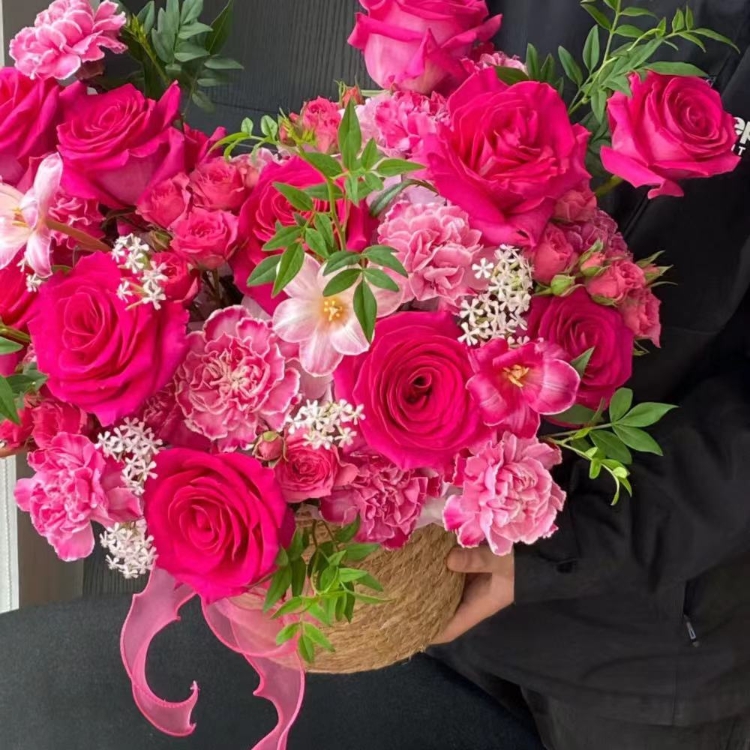 热烈的玫红色弗洛伊德玫瑰搭配可可西里红康乃馨,多头苏菲宝贝